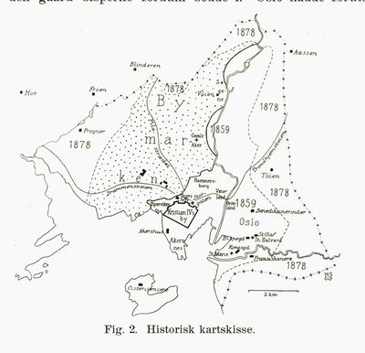 I 1735 kommer den første klare fastsettelsen av det ytre byområdet som vi kjenner. Grensa som ble trukket ved en oppmåling det året fikk fra Skillebekkens utløp, langs gårdene Frogner, Frøen, Blindern og Ullevål fram til Bjølsens grense i nord. Deretter gikk den sørvestover til Akerselva, og fulgte stort sett elva ned til Bjørvika. Dette utgjorde et område på 5559 dekar.