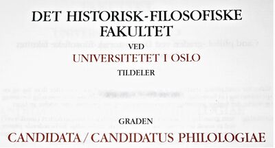 Faksimile av vitnemål fra Universitetet i Oslo (1998): candidata/candidatus philologiae.