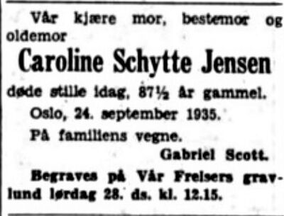 Caroline Schytte Jensen er gravlagt i familiegrav på Vår Frelsers gravlund i Oslo.