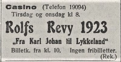 Særlig samarbeidet med den svenske sangeren og revyskaperen Ernst Rolf var vellykket, hvor revyen Fra Karl Johan til Lykkeland med premiere 1. juli 1923 ble en stor suksess. Før dette hadde teateret og Ernst Rolf produsert utstyrsrevyen Kvinden du gav mig med premiere 1. juli 1922 som var Ernst Rolfs første praktrevy i Kristiania.
