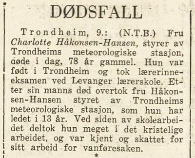 Da mannen døde i 1933, overtok Charlotte Håkonsen-Hansen Trondheim meteorologiske stasjon, som hun ledet i 13 år. Da hun døde i 1944, var hun følge Norges Kvinder, "den første og eneste kvinne som har hatt en slik ledende stilling som meteorolog.".[2]