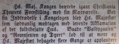 Faksimile fra Aftenposten 13. desember 1861: Utsnitt av omtale av at kong Karl IV hadde gjestet Christiania Theater dagen før.