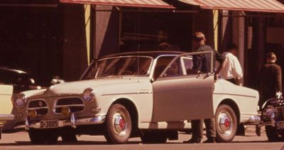Volvo Amazon med kjennetegnet D-3005 har parkert i Strandgata på Hamar, ca. 1963. 3000-serien tilhørte Hamar politidistrikt.