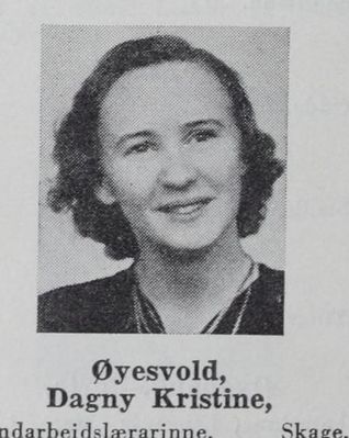 Håndarbeidslærerinne Dagny Kristine Øyesvold, født 1924 i Overhalla kommune. Etter en kort periode som vikar ved Torshov skole i Oslo ble hun ansatt ved Sund folkehøgskole i Inderøy kommune. Dagny Kristine hadde utdanninga si fra blant annet Trøndelag kvinnelige husflidsskole i 1942 og kurs ved lin- og kjolesøm ved Den kvinnelige industriskole i Oslo. Foreldrene var fabrikkeier Magnus Øyesvold og Karen Skei.