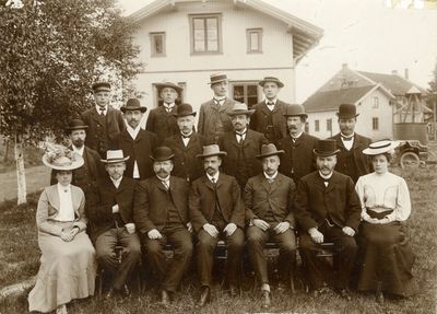 1. rad fra v.: Frk. Tommelstad, Arne Damhaug, Syver Damhaug, Fred Gay, J.B. Lund, K. Brynildsbakken, Helga Farup. 2. rad: Olaf Fjeldstad, O.M. Sæther, Iver Larsen, Jørgen Haugen, Henrik Berg, Laurits Henriksen. 3. rad: Henning Farup, Carl L. Hanssen, Christian Damhaug, Haldor Farup.