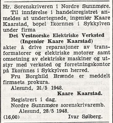 I 1950 reiste Kårstad frå Sykkylven. Året etter heldt Oddvar Rieve Kristiansen fram med drifta i A/S Møre Transformatorfabrikk.