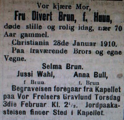 - Morgenbladet 2. februar 1910, dødsannonse.