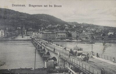 - Bybrua i Drammen i 1871, i retning Bragernes.Foto: Knud Knudsen