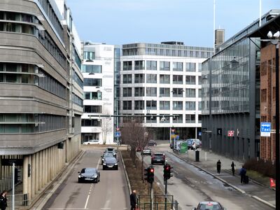 | 60 | 1958–1960 | Kontorbygg | Oppført for Rikstrygdeverket, ark. F.S. Platou. Rikstrygdeverket flytta ut 2003, og bygningen ble etter ombygging tatt i bruk av Skanska Norge. Tidl. løkka Biebak. Bak forretningsbygget en barnehage fra 2010. | |