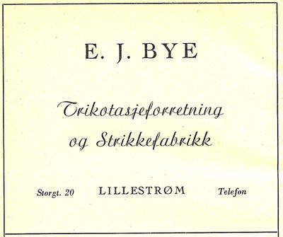 E. J. Byes trikotasjeindustri ble opprettet i Mjøndalen i 1922, men flyttet til Lillestrøm i 1939. Bedriften var også en strikkefabrikk. Den produserte jakker og jumpere. Bye holdt til i Storgata 20. Den endret trolig navn til E. J. Bye Trikotasjeforretning og Strikkefabrikk.