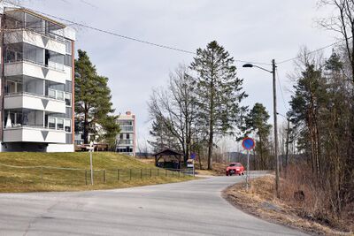 Edvard Myhres veg på Klyve i Skien kommune går nordover fra Hulkavegen til parkeringsplasser ved blokkbebyggelse.