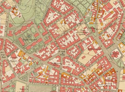 Kart sentrert på St. Olavs plass som viser bryggeriets to anlegg med det daværende navnet Fortuna Bryggeri, nederst til høyre og i venstre bildekant, på Krums kart fra 1888.