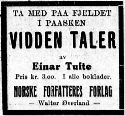 Annonse for romana Vidden Taler i Aftenposten i april 1924.