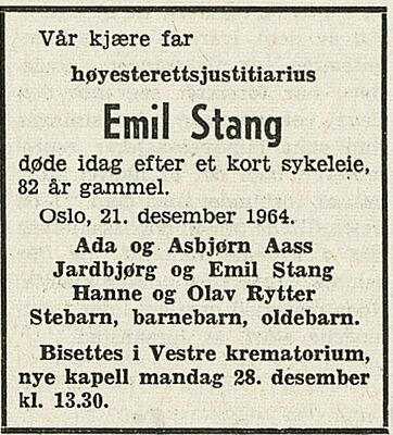 I et minneord over Emil Stang i Aftenpostens aftennummer 21. desember 1964 (usignert) ble han beskrevet slik (utdrag):