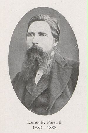 - ↑ Hasvold, P. M.. Bardu. Utg. Dreyer. Stavanger. 1924: Lærer E. Forsæth 1882-1888: https://www.nb.no/items/URN:NBN:no-nb_digibok_2018071348015?page=39