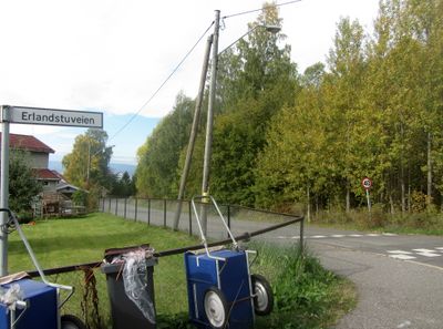 Erlandstuveien sett østover fra krysset med Samvirkeveien og Smedstusvingen.