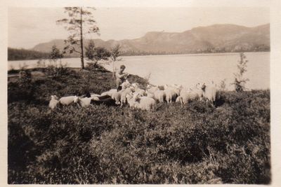 | Tysdag 27. juli. Etter kvellsmaten gikk vi en tur i lia på østsida av vatnet. Ho åpenbara sig som det herligste land for en opdagingsreise. Under bjørkens lune skygge finner du idyller hvor de grønneste bregner kappes med det saftige gress og den bløteste fine smyle. I livd av bjørkene som nå vokser på de gamle setervoller løyner seg restene av gamle hus. Og med litt fantasi kan du se for deg en støyl ved vatnet, så fin som få. Det er i kvellingen, og du tykkes høre bjellelåt fra bølingen som trekker heim langs med stranden. Fra bua stiger røyken tilværs i den stille kvellsluft. Smørgrauten står over, snart får du smake. Men akk!
