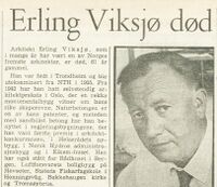 - «Arkitekt Erl. Viksjø». Aftenposten 1971.12.04. Digital versjon på Nettbiblioteket.