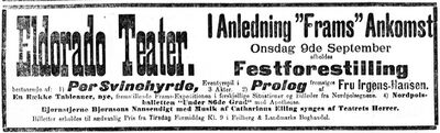 Faksimile fra Aftenposten 8. september 1896: Annonse for forestilling på Eldorado i anledning polarskipet "Fram"s hjemkomst til Kristiania samme dag.