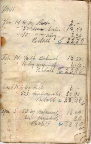 Side 1 i Peder Mathissens handlebok i Fauskevåg Kjøpelag. Det gikk i melvarer. De øvrige fornødenheter skaffet man seg på egen gård og fra egen båt.
