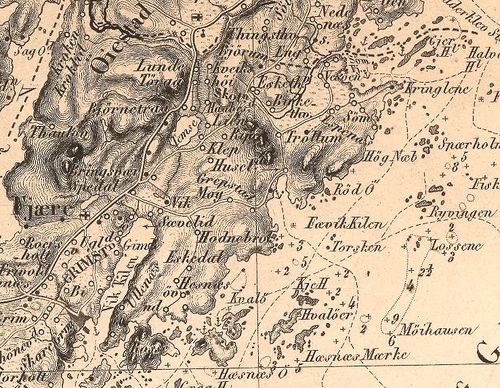 Dette kartet har mange av opplysningene som vi også finner i 1850-utgaven. Men kanskje er dette noe mer rettet mot sjøfarende, for her er merket og navnsatt svært mange grunner og skjær. Skrivemmåten - og skrivefeilene? - fra 1850 henger fortsatt med.