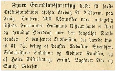 I november 1883[1] arrangerte Fjære grundlovsforening et diskusjonsmøte på Fevik. Der møtte omkring 200 mennesker. Det var lensmann Ulstrup som var formann i foreningen. Han innledet om temaet "den kongelige Santionsret". I debatten deltok - fra Venstre - redaktør Svendsen, skolebestyrer Davidson og Asbjørn Knutsen. Fra Høyre deltok distriktslege frisak, sakfører Boe og Smit-Petersen.