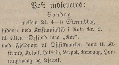 "Ifølge Oscar Sunds «Norge vårt land» eksisterte i foregående århundre en vinterpostrute Tromsø—Alta—Haparanda, angivelig opprettet allerede i 1798. Og fhv. postmester E. B. Eriksen bringer i en artikkel i Troms Filatelistklubbs jubileumsskrift i 1937 en del nærmere opplysninger om ruten, her kalt Tromsø-Naunu—Haparanda, som trafikertes med reinskyss fra Balsnes eller Skibotn. Avhengig av vær og føreforhold tok turen fra 3—4 opp til 10 døgn eller mere, og nordgående posts ankomst til Tromsø ble kunngjort ved at en mann gikk rundt i gatene og ropte «Fjeldposten er kommet». Skjønnlitterært er dessuten «Fjeldposten»s ankomst til Tromsø omtalt i Bernt Lies «Gabriel Selje».