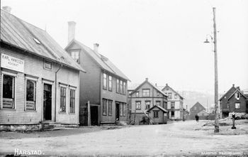 | 11 | På denne tomta bygde John S. Bjørhovde snekkerverksted i 1904 (han fikk senere avslag på å installere ovn på kontoret til verkstedet). Sønnen, trelasthandler Reidar Bjørhovde overtok i 1930 og hadde trelastlager og kai. Han bygde senere en kontorbygning med fasade mot fjordgata som i nyere tid ble oppkjøpt av Harstad Tidende og revet. | |