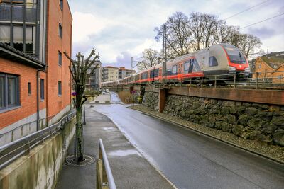 Fleischers brygge sett mot nord. Gjennom jernbaneundergangen til høyre går Fleischers gate.