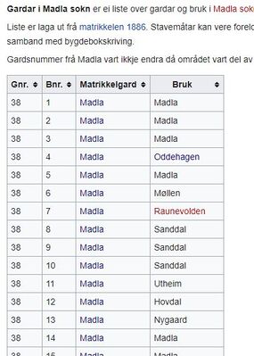 Per 21. april 2022 er det stort sett berre bruk som fanst i 1886-matrikkelen som står i desse tabellane. Tanken er i fyrste omgang å utvide med bruksnummer frå matrikkelutkastet av 1950. I tillegg finst det fleire tusen seinare bruksnummer i område som er sterkt urbaniserte. Å ha med alle desse i hovudtabellane vil gjere det for uoversiktlig, og difor må vi finne andre løysingar over tid.