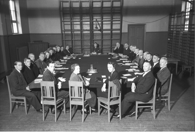 Oppegård herredsstyre 1929-1931, ordfører Kristian Horgen i bakgrunnen. Møtene ble avholdt i gymsalen på Kolbotn skole.