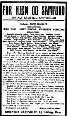 For hjem og samfund var et lite «social kristelig kvindeblad», etablert i 1914 i Bergen av Marie Michelet med Wilhelmine Wergeland, Henny Donns og Dagny Johnson i redaksjonen. Bladet hadde som mål å være noe annet enn enkel underholdning for kvinner og diskuterte ofte store temaer som satte kvinnen i sentrum som en viktig samfunnsborger.