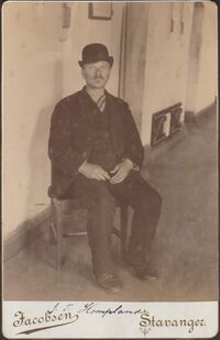 Bildet viser Jørgen Tollefsen Hompland fotografert sannsynligvis i arresten på Stavanger politikammer. Baksiden av bildet (ikke vist her) har påskriften "1035/94" som kan henvise til et registreringsnummer og årstall (1894). I Polititidende 1894, nr 56-B23 står det at Hompland er 11/7-94 arrestert i Stavanger for tyveri og bedrageri. Hompland hadde kort tid før blitt løslatt fra en 9 års soning ved Bergen og Trondheim fengsel for tyveri. Dette bildet ble sendt til Kristiania-politiet sannsynligvis for en bekreftelse av at han var en tidligere straffefange med lang fartstid i fengsel. Dato for bildet er da sannsynlig på, eller noen dager etter, 11. juli 1894 |