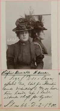 Den avbildede er Olufine Henriette Hansen, 19 år fra Bergen, som var registrert som prostituert i Kristiania. Hun har også et rulleblad for tyverier, og er her arrestert for et nytt slikt. Kvinner ble ofte fotografert med, og uten, hatt, når i sivil. Teksten P.t. no 66-D-2-1900, refererer til Polititidende år 1900 seksjon D2, hvor løslatelser ble offentliggjort. Her[8] står det at Olufine har sonet 3 uker ved Akershus amt distriktsfengsel for tyveri, fra 17. august 1900. Slike korte dommer ble raskt prossesert i byretten, og arrestasjon og fotografering kan dateres til f.eks. rundt månedskiftet juli/august 1900. |