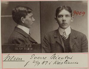 Arrestasjonsfoto med dobbelteksponering forfra og profil. Det ble typisk plassert et skilt foran profilen hvor fangenummer og dato ble skrevet, og avbildet som del av portrettet. Bildene var ihht Bertillon-systemet som ble innført ved Opdagelsesavdelingen i 1905. |