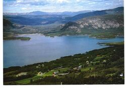 Skredvatn. Skafså i bakgrunnen, Hauggrend i framgrunnen.