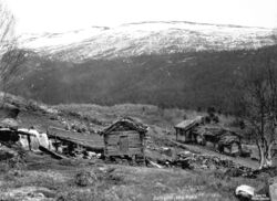 Gjerden 1965. Frå venstre Der Nord, Derinne og Attistog. I øvre, venstre biletkant skimtar ein Huldreheimen. Foto: Fjellanger Widerøe