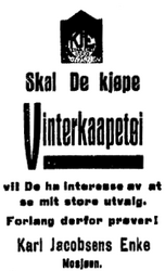 Med annonser som denne, forsøkte Karl Jacobsens Enke å nå folk også utenfor Mosjøen.