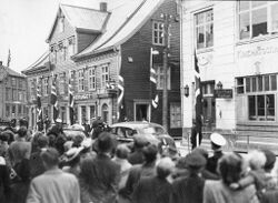Kong Haakon på vei til middag i Folkets Hus i 1946. Ukjent fotograf/Perspektivet Museum