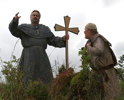 Korset utenfor porten til Gulen kirke. Korset er 2,7 meter høyt og av nord-keltisk type med rette armer og topptykke, og med halvsirkelformede hull mellom disse. Foto: John Erling Blad (2008)