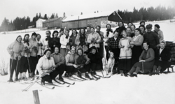 Roa sanitetsforening på skitur i Nordre Oppdalen i 1953. I midten foran, til venstre for hunden, er foreningens mangeårige leder Astrid Askersrud. Eier: Randsfjordmuseet