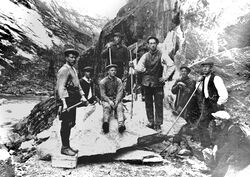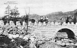 Den gamle brua nedanfor Hoslemo på prospektkort frå 1890-talet. Frå samlinga til Ingebjørg Vegestog.