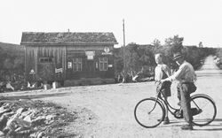 Dette biletet av den fyrste butikken på Hovdebru vart truleg teke kring 1950. Mannen med hatt er Olav P. Tveiten. Frå Setesdalsmuseet. Fjellgardstun er ein bustadseigedom på Hovden i Bykle kommune. Moland er namnet på den fremre delen av tomta der Fjellgardstun nå ligg. Tidlegare sto her ein butikkbygning som Knut Tarjeisson og Kjetil Sveinsson Hovden sette opp i 1937. I dette huset var bustadrom i andre høgda. Tone Kjetilsdotter Hovden dreiv butikken her inntil ho og Harald Uleberg, mannen hennes bygde ny forretning på motsett side av vegen i 1951 (sjå Urheim, bnr 23).