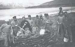 Krigshistorie Hemnes i Nordland/11: «Jernbanen skal fram»: Jernbanearbeidere, antakelig 1941. Fra venstre: ukjent, ukjent, Jakob Hjerpbakk, Arnt Lauvbakk, ukjent, ukjent, ukjent, Ole Martinsen, ukjent, Arne Lillebjerka, ukjent. Foto: Ukjent, bildet utlånt av Jakob Hjerpbakk.