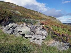 Øvre Åkerstølen, med ruinar etter ei steinbu i framgrunnen. Foto: Marianne Wiig (2012)