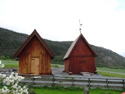 Hindrem stavkirke og servicebygget Foto: Rolf-Arne Evensen/kilde: Eget foto