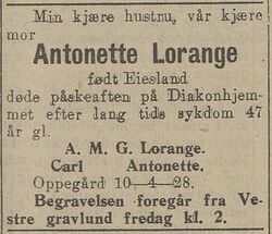 Dødsannonse for Antonette Lorange i Tidens tegn 11.4.1928 Antonette Lorange f. Eiesland (født 7. mars 1881 i Fjotland kommune, død 7. april 1928 i Oppegård kommune) var Oppegård kommunes første kvinnelige herredsstyremedlem. Hun var med i lokalpolitikken i perioden 1917-1919 og hun var også innvalgt i skolestyret og fattigstyret. Lorange var leder for Oppegård sanitetsforening som hun også var med på å stifte. Les mer …