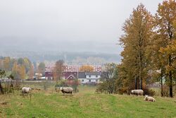 Skjerven gård i Maridalen med beitende sauer i forgrunnen. Foto: Leif-Harald Ruud (2014)