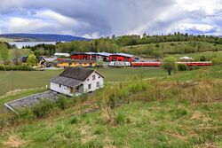 Et tog i retning Bergen er i ferd med å passerer Tyristrand stasjon på Randsfjordbanen. Foto: Leif-Harald Ruud (2020)
