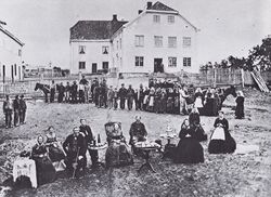 Storgarden Rogneby (Rånåby) i 1867. Sjølfolka sitter foran, mens en stor flokk med husmanns- og tjenestefolk står i bakgrunnen.